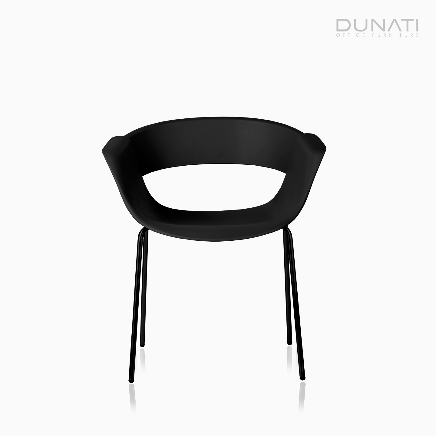 Silla multipropósito cuatro patas con estructura cromada o electropintada negra y casco monoblock en polipropileno. Disponible en coral.