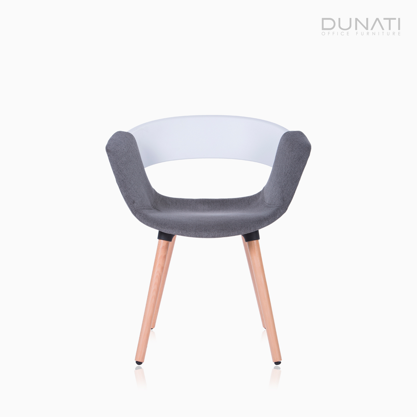 Silla Gia Multipropósito estructura cuatro patas madera con asiento tapizado en tela gris y respaldo en PP blanco.