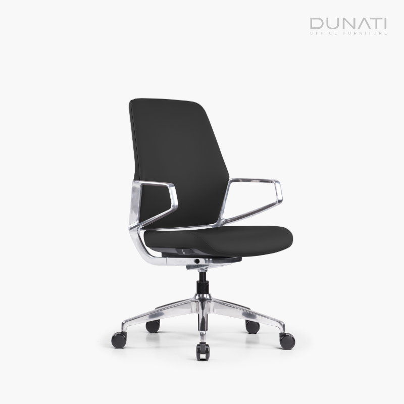 Silla / sillón gerencial Midas. Brazos fijos en aluminio, asiento regulable en altura. Base estrella enaluminio. Tapiz ecocuero negro. La silla Midas posee un premio reddot.
