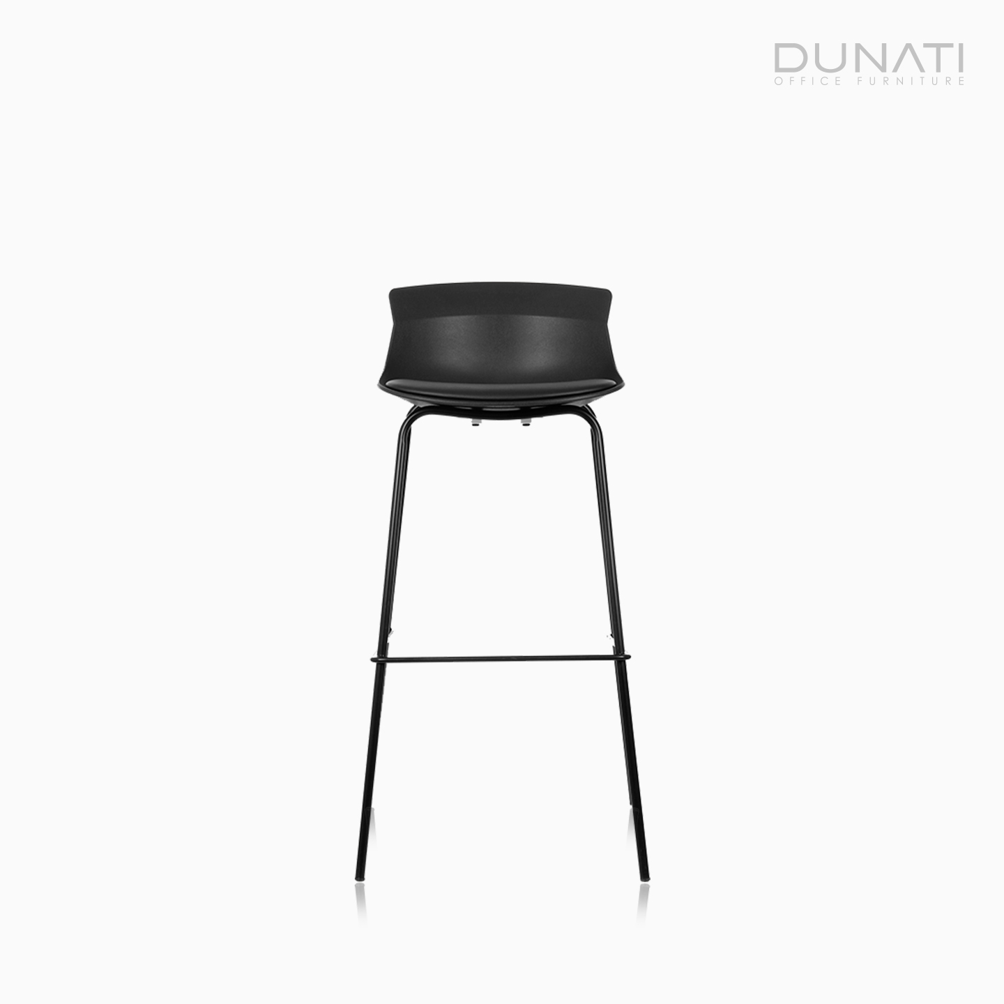 Taburete multipropósito cuatro patas con estructura negra y casco monoblock en polipropileno, con cojin tapiz PU negro.